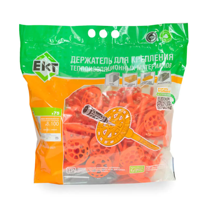 Зонт для теплоизоляции (дюбель тарельчатый) ЕКТ 8х100 со стальным гвоздем с высокоэффективной термоголовкой применяется для крепления теплоизоляционных материалов в бетон, полнотелый кирпич, пустотелый керамический кирпич, газосиликат и керамзитобетон.