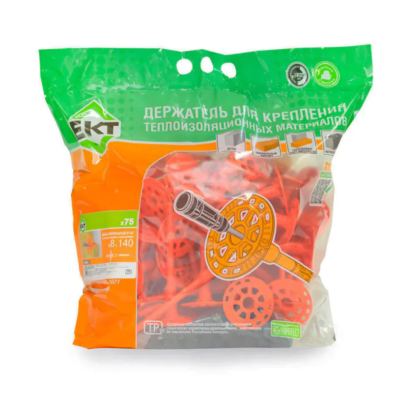 Зонт для теплоизоляции (дюбель тарельчатый) ЕКТ со стальным гвоздем с высокоэффективной термоголовкой применяется для крепления теплоизоляционных материалов в бетон, полнотелый кирпич, пустотелый керамический кирпич, газосиликат и керамзитобетон.