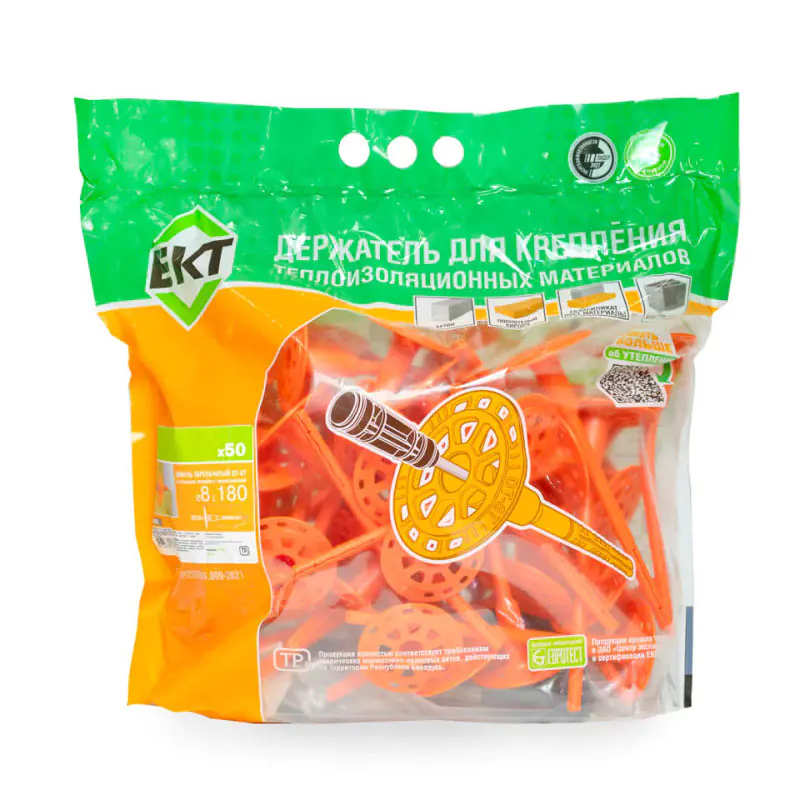 Зонт для теплоизоляции (дюбель тарельчатый) ЕКТ DT-8T-180 8х180 со стальным гвоздем с высокоэффективной термоголовкой применяется для крепления теплоизоляционных материалов в бетон, полнотелый кирпич, пустотелый керамический кирпич, газосиликат и керамзитобетон.