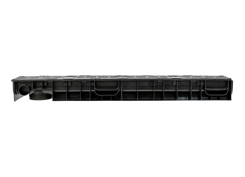 Канал пластиковый системы STANDART из вторичного ПЭ-ПП. Сформированное отверстие для подключения труб Ø 50 мм., Ø 110 для выпуска через дно лотка. Специальный паз для подключения других лотков под углом 90º и специальным пазом для распила лотка. Чугунная решетка с продольными щелями. Крепление: крепеж-валик элемент безболтового соединения решетки с лотком.