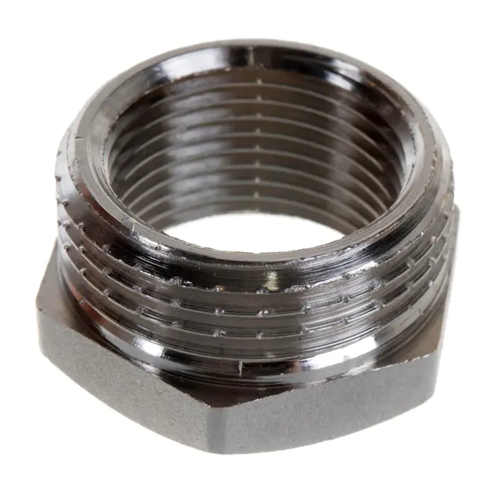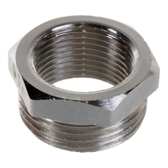 Футорка – фитинг, обеспечивающий соединение труб разного типоразмера, подключение трубопровода к элементу системы с большим диаметром присоединительного патрубка, ремонт (замену) поврежденной резьбы. Изделие выполнено из латуни марки CW617N, никелировано. Резьба – наружная/внутренняя, по типу – трубная цилиндрическая, совместимая с наружной конической (ГОСТ 6211).