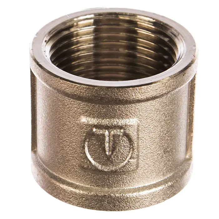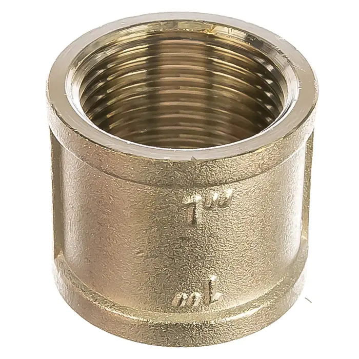 Соединительная муфта 1" с внутренней резьбой. Изготовлена методом объемного горячего объемного прессования из сантехнической латуни марки CW617N (европейский стандарт EN12165) с гальваническим нанесением никелевого покрытия. Цилиндрическая трубная резьба муфты совместима также с наружной конической по ГОСТ 6211 (ISO R7). Максимальное избыточное давление применения фитинга определяется максимальной температурой рабочей среды, типоразмером изделия (условным диаметром до/более 1”): при 120 °С – 40/25, 200 – 30/27, 250 – 27/17 бар.