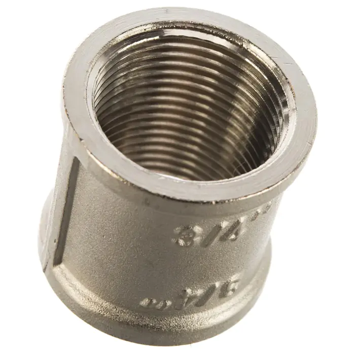 Соединительная муфта 3/4" с внутренней резьбой. Изготовлена методом объемного горячего объемного прессования из сантехнической латуни марки CW617N (европейский стандарт EN12165) с гальваническим нанесением никелевого покрытия. Цилиндрическая трубная резьба муфты совместима также с наружной конической по ГОСТ 6211 (ISO R7). Максимальное избыточное давление применения фитинга определяется максимальной температурой рабочей среды, типоразмером изделия (условным диаметром до/более 1”): при 120 °С – 40/25, 200 – 30/27, 250 – 27/17 бар.
