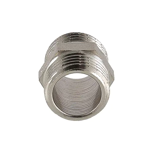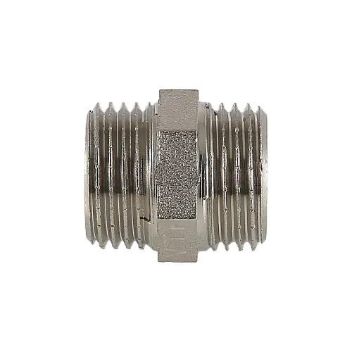 Латунный никелированный фитинг для соединения элементов трубопровода равного диаметра. Резьба – наружная/наружная, цилиндрическая трубная по ГОСТу 6357 (ISO 228, EN 10226). Предусмотрен участок корпуса шестигранной формы, под гаечный ключ. Размер резьбы - 1/2".
