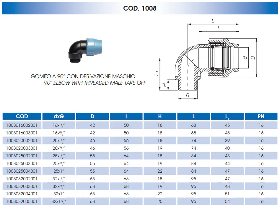 Отвод с наружной резьбой для ПЭ труб 25х1/2" UNIDELTA компрессионный фитинг предназначен для соединения труб из полиэтилена низкой плотности, используется для транспортировки питьевой воды и жидкости под давлением, обладает высокой сопротивляемостью к различным химическим веществам, устойчив к УФ излучению.