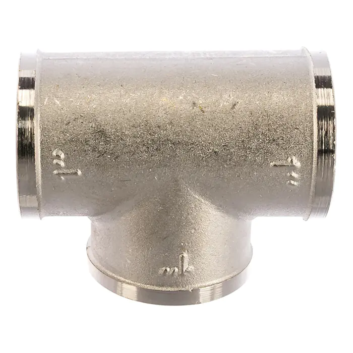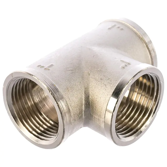 Латунный никелированный трехсторонний фитинг, равнопроходной Valtec 1". Резьба – внутренняя, цилиндрическая трубная по ГОСТу 6357 (ISO 228, EN 10226), совместимая также с наружной конической трубной резьбой по ГОСТу 6211 (ISO R7).