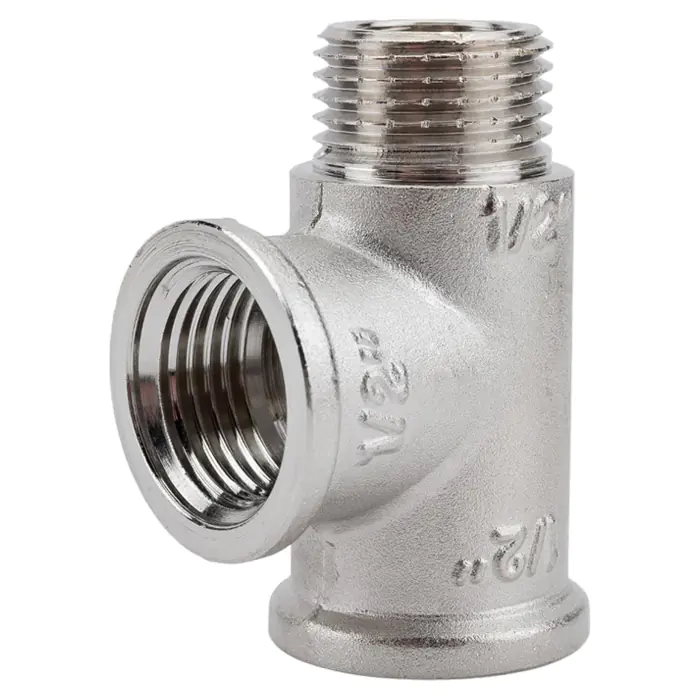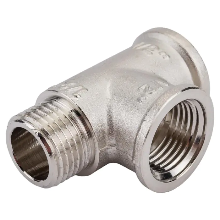 Тройник с переходом на наружную резьбу 1/2 вн.-вн.-нар. Valtec изготовлен из латуни марки CW617N методом горячего штампования с последующим нанесением никелевого гальванопокрытия. Применяется для создания разъемных резьбовых соединений на трубопроводах из стальных, медных, латунных, пластиковых и металлопластиковых труб. Резьба – трубная цилиндрическая по ГОСТу 6357 (ISO 228, EN 10226), наружная/внутренняя/внутренняя. Допускается соединение внутренней резьбы с наружной конической трубной по ГОСТу 6211 (ISO R7). Наружная резьба фитинга имеет насечки для эффективного удержания уплотнительного материала.
