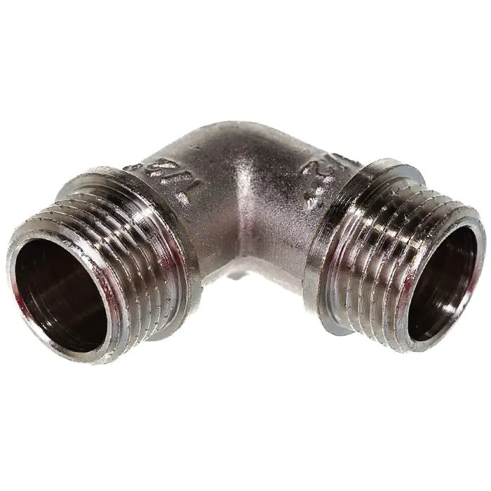 Угловой латунный никелированный фитинг Valtec 1/2". Резьба – наружная/наружная, цилиндрическая трубная по ГОСТу 6357 (ISO 228, EN 10226).