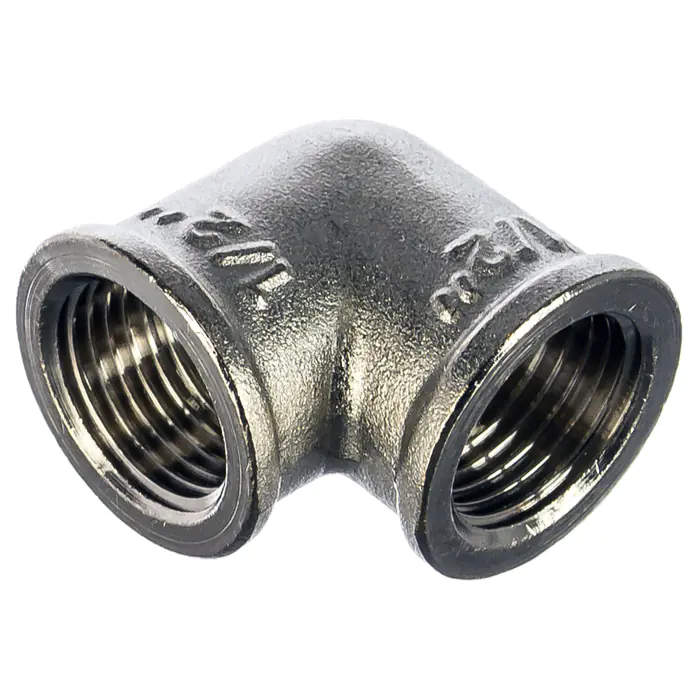 Угловой латунный никелированный фитинг Valtec 1/2". Резьба – внутренняя/внутренняя, цилиндрическая трубная по ГОСТу 6357 (ISO 228, EN 10226), совместимая также с наружной конической резьбой по ГОСТу 6211 (ISO R7).