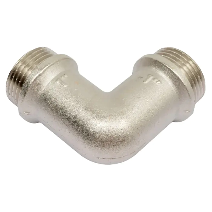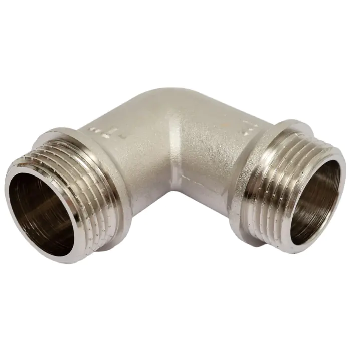 Угловой латунный никелированный фитинг Valtec 1". Резьба – наружная/наружная, цилиндрическая трубная по ГОСТу 6357 (ISO 228, EN 10226).