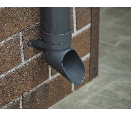 Слив соединяется с водосточной трубой и служит для отвода воды от цоколя в дренажный колодец или дренажный канал.