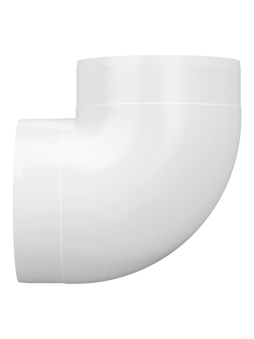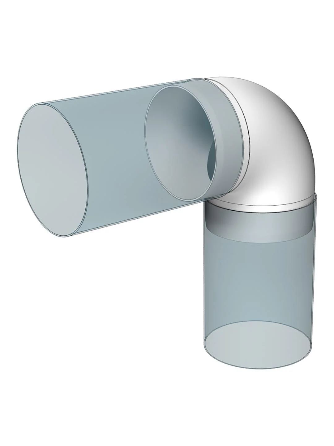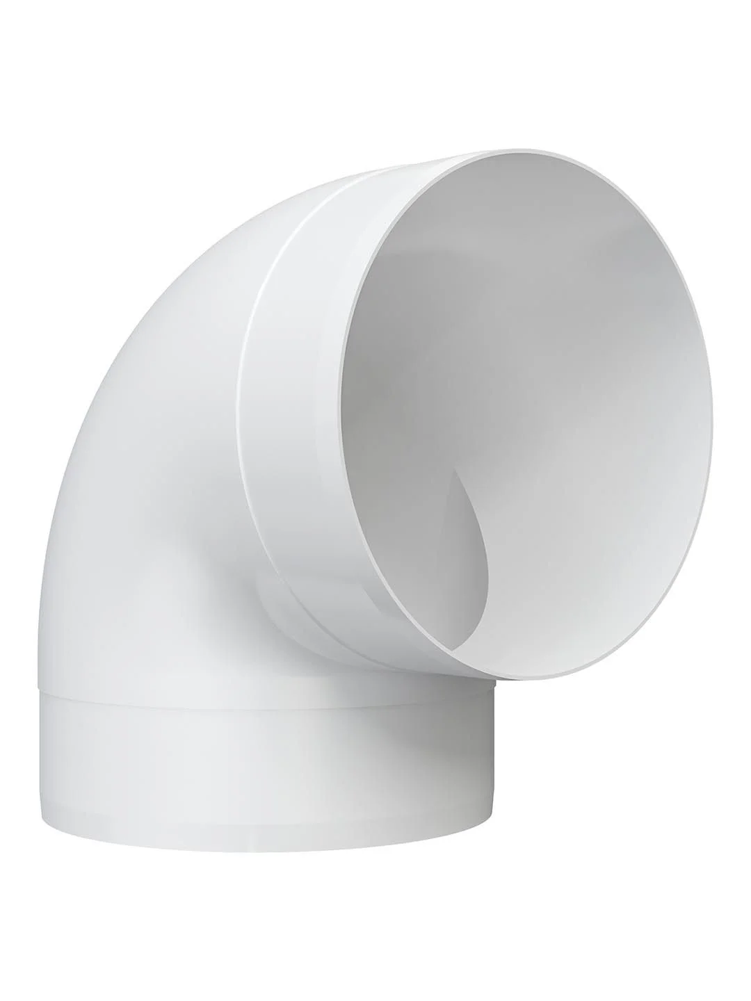 Колено пластиковое 90º для круглых воздуховодов 100 мм. Применяется для соединения круглых воздуховодов одного диаметра под углом 90º.