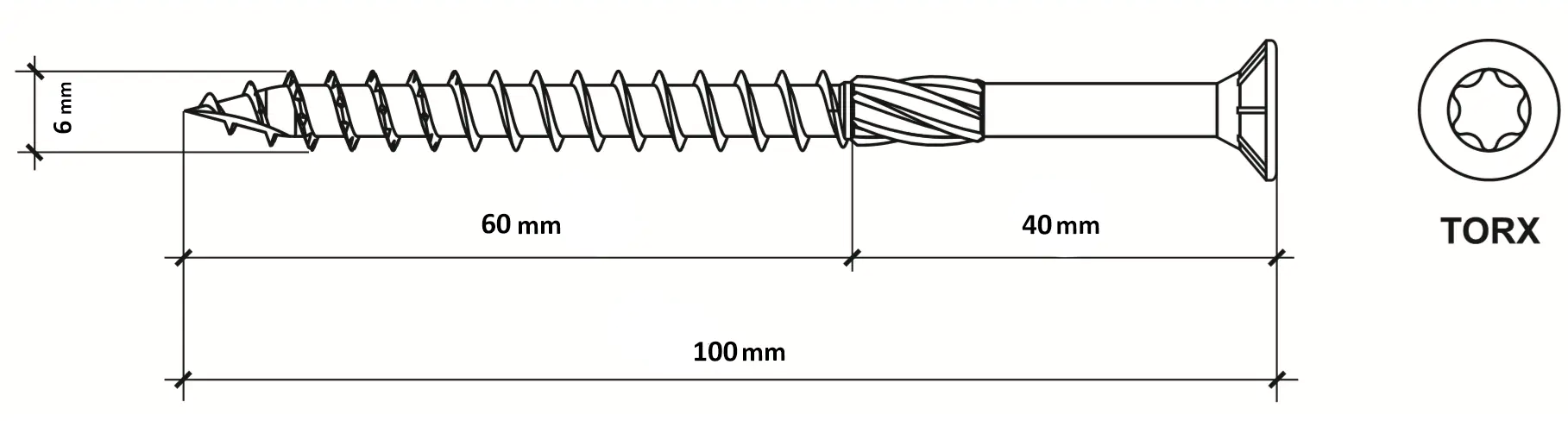 Саморез конструкционный Klimas KMWHT 6.0*100 мм применяется для соединения изделий из дерева (деревянные конструкции из сруба, досок) или изделий на основе дерева (фанерных плит, МДФ плит и т.д.).